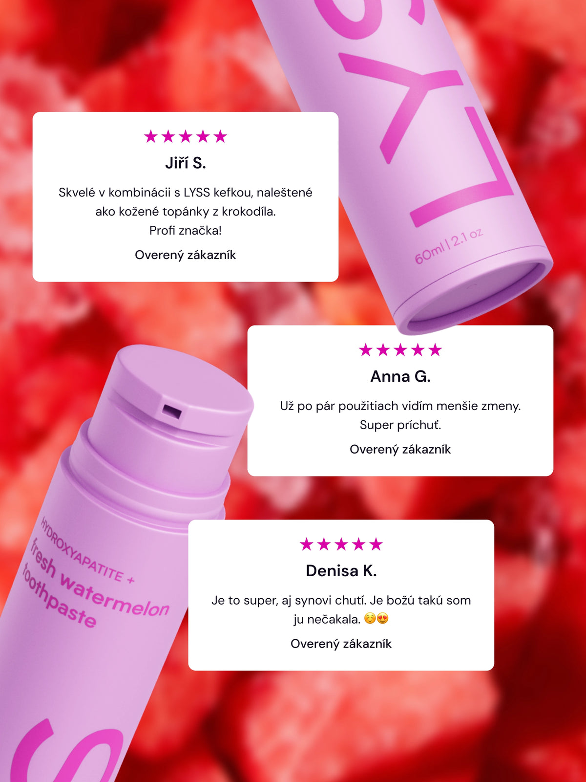 S našou ochutenou zubnou pastou LYSS tí iba 2 minúty nebudú nikdy stačiť. Zloženie bolo starostlivo vyvinuté z klinicky preukázaných zložiek, ktoré efektívne bielia zuby, zabraňujú vzniku zubného kazu, znižujú citlivosť zubov, podporujú zdravšie ďasná a zlepšujú celkový stav tvojich úst.