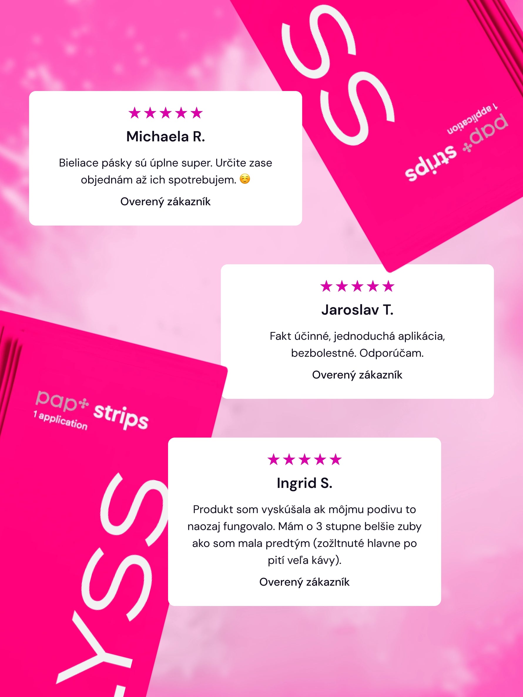 Bielenie bez bolesti? Ide to! Dosiahni žiarivo bieleho úsmevu s PAP+ pásikmi na bielenie zubov, ktoré kombinujú 3 vedecky overené zložky pre účinné bielenie a starostlivosť o zubnú sklovinu.