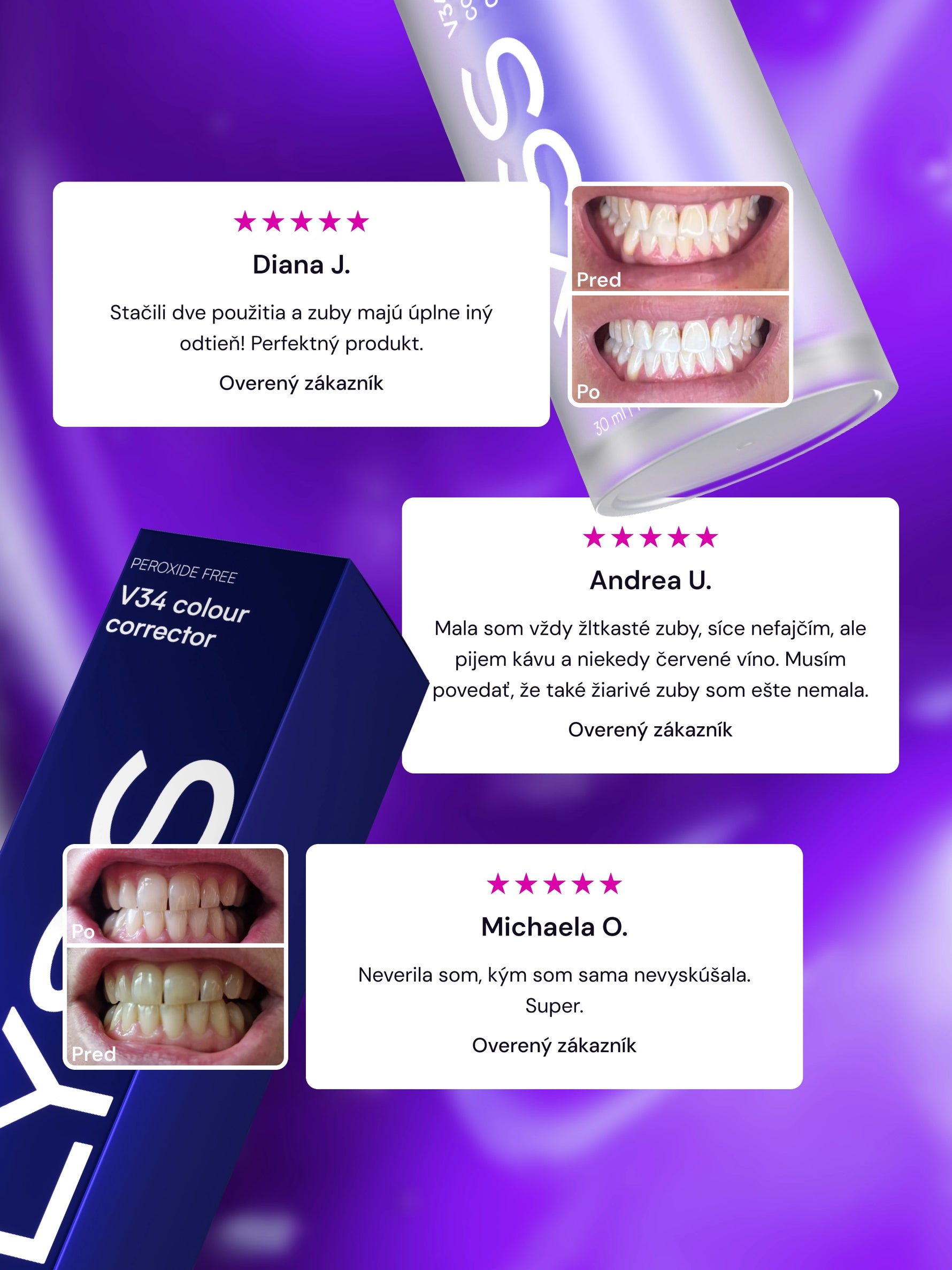 V34 pasta na bielenie zubov funguje okamžite. Neutralizuje zažltnuté tóny a podčiarkne prirodzenú belosť tvojich zubov. Stačia dve minúty a tvoj úsmev pôsobí zdravšie a sebavedomejšie, bez potreby chodiť na nákladné a zdĺhavé procedúry.