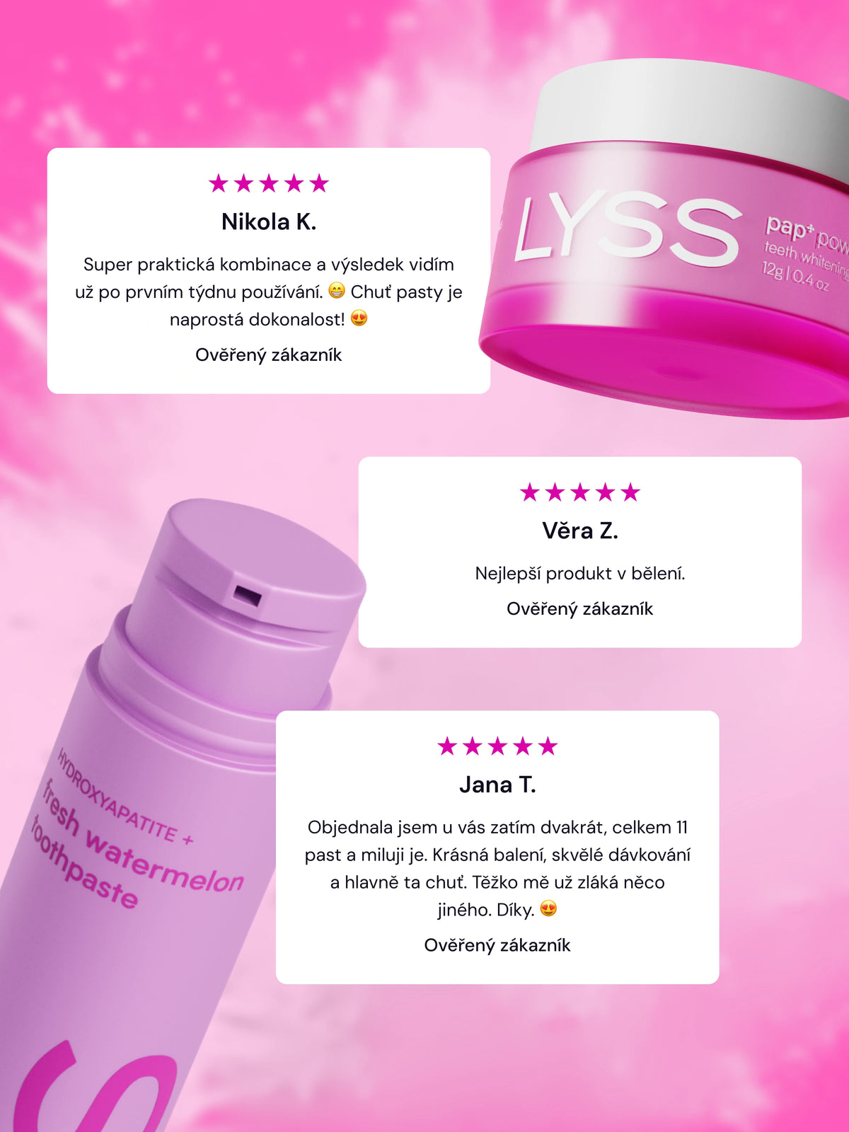 Balenie obsahuje 1x PAP+ bieliaci púder (~2 mesiace) a 1x ochutenú zubnú pastu LYSS (60ml).