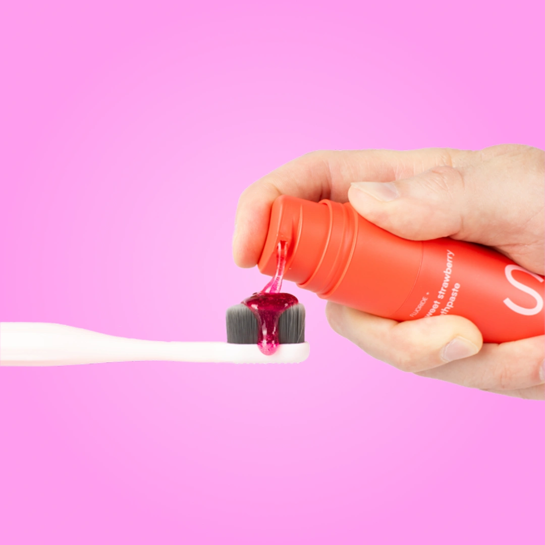 Najprv aplikujte dve pumpičky našej lahodnej zubnej pasty na zubnú kefku. Odporúčame využiť našu extra jemnú LYSS zubnú kefku.